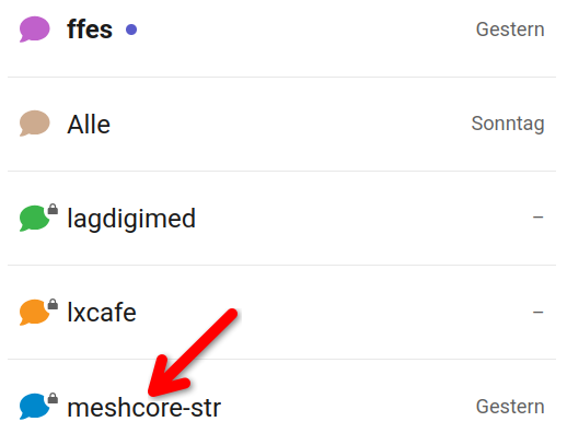 Für Teilnehmer aus der Meshcore Community gibt es eine öffentliche Haupt-Kategorie „Meshcore STR“ und eine interne Unterkategorie „STR intern“, die nur mit Anmeldung und Benutzerberechtigung für die Community „ffes“ sichtbar ist. Für die interne Chat Kommunikation wurde eine separate Gruppe „meshcore-str“ angelegt. Sie kann die Signal Gruppe „Meshcore STR Orga“ ersetzen. Der offene Signal Chat „Meshcore STR“ soll als Startpunkt für neue Meshcore Aktive erhalten bleiben.