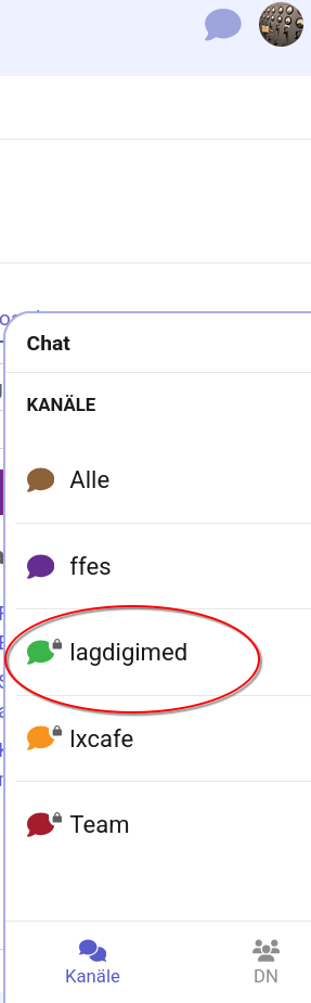 Für die LAG Mitglieder wurde ein neuer Gruppen Chat Kanal angelegt. Er funktioniert ähnlich wie ein Gruppen-Chat in Signal und ist über das Chat Symbol oben rechts erreichbar. Neun Personen, die sich als LAG Mitglieder registriert haben, sind im Gruppen Chat erreichbar. Neue Teilnehmer werden automatisch hinzugefügt, sobald sie Zugriffsrechte in die Benutzergruppe “LAGDigiMed” haben.
