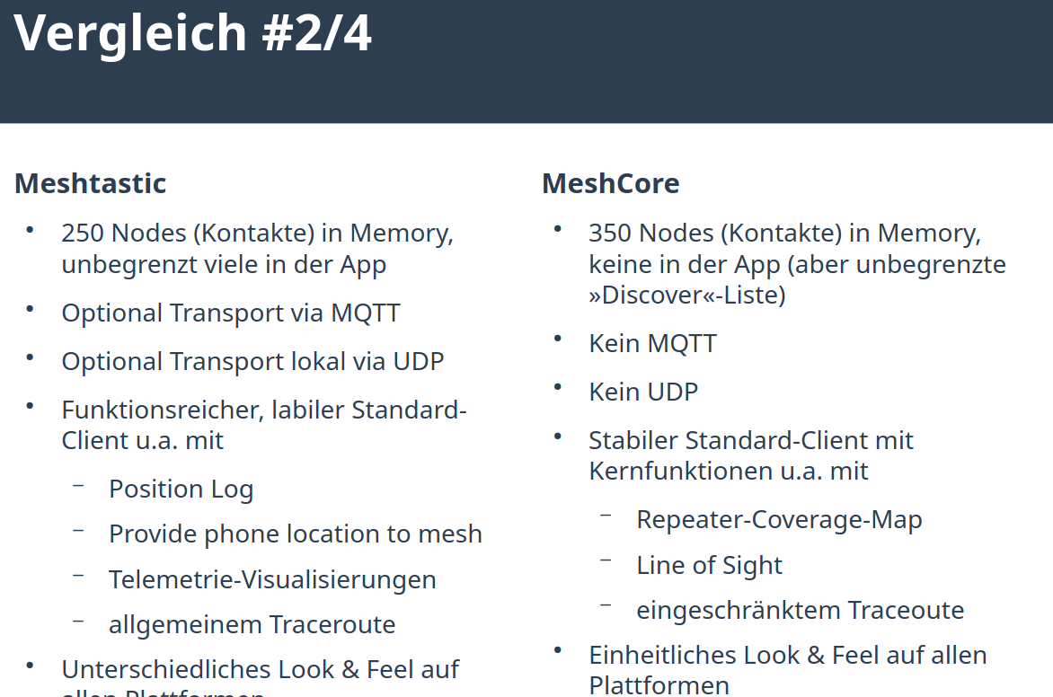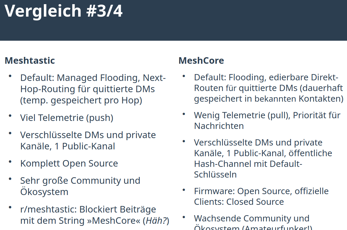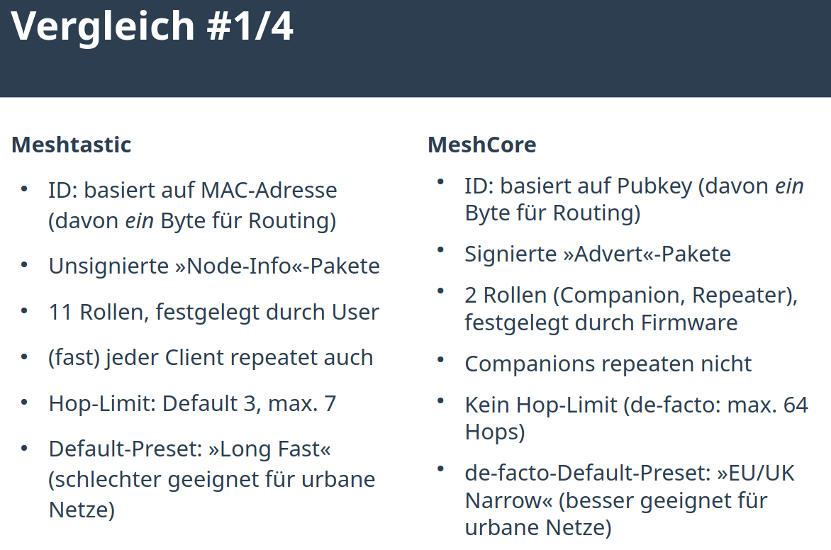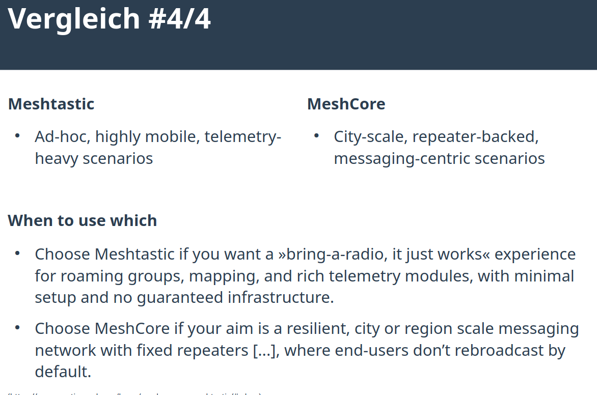 Im Foliensatz von Heinz/Harvey ( Heinz (@harvey@chaos.social) - chaos.social ) vom Chaostreff in Ludwigsburg Januar 2026 wird der technische Vergleich zwischen Meshtastic und Meshcore dargestellt: https://complb.de/CompLB-Kramski-MeshCore-20260129_v02.pdf