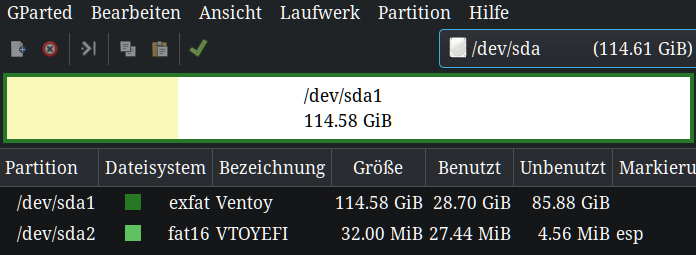 Damit Secure Boot auch mit Ventoy funktioniert, muss man mindestens die Ventoy Version 1.1.07 vom 18. August 2025 benutzen. Wenn der Rechner wegen eines fehlenden Schlüssels das Ventoy nicht annimmt, erscheint ein blau hinterlegter Bildschirm. Dort kann man den fehlenden Schlüssel in die Schlüsseldatenbank des UIEFI BIOS importieren (enroll MOK - machine owner key). Der Schlüssel befindet sich auf der EFI Partition des Ventoy USB Sticks: